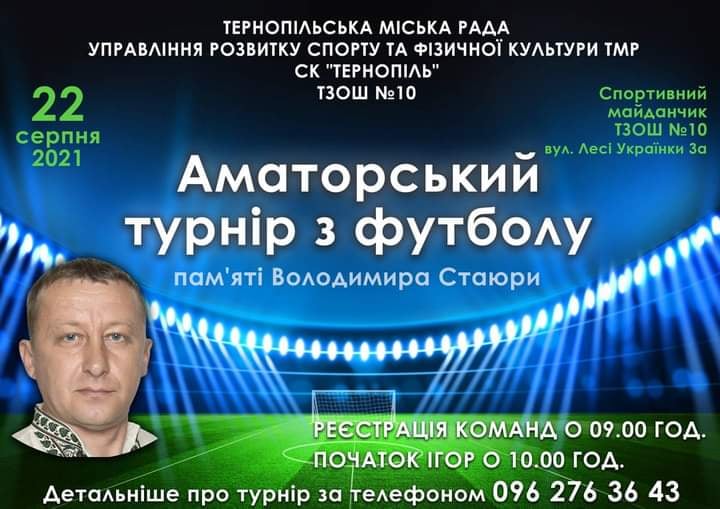22 серпня на універсальному спортивному майданчику ТЗОШ №10 (вул. Лесі Українки, 3-А) відбудеться аматорський турнір з міні-футболу, присвячений пам’яті Володимира Стаюри.