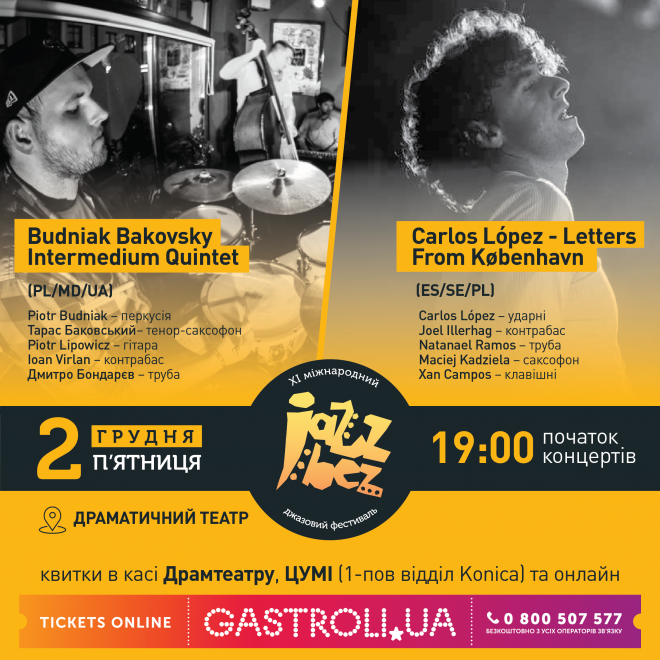Іспанський джазмен зі світовим ім’ям Carlos López та колектив «Budniak Bakovsky Intermedium Quintet» виступлять у Тернополі на фестивалі JazzBez 2 грудня.