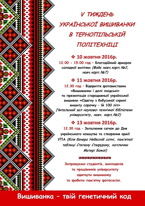 10 – 15 жовтня 2016 року у Тернопільській політехніці відбудеться V Тиждень української вишиванки.