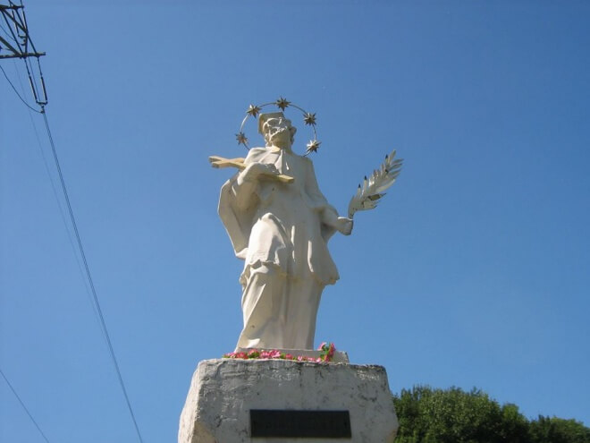 Святий зображений з пальмовою гілкою у руках, у сутані та вінком зірок над головою. На цьому місці пам’ятник поставили у 1896 році, а відновлено скульптуру було у 2008 за сприяння парафії св. Апостола Петра (УГКЦ) та монастиря ЧБМ.