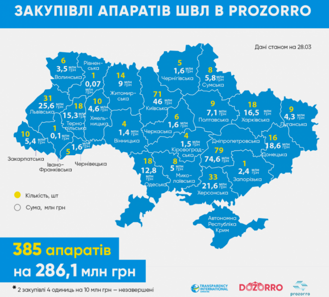 Тернопільська область посідає п’яте місце в Україні за кількістю придбаних апаратів штучного дихання станом на 28 березня. Якщо порівняти кількість придбаних апаратів штучного дихання Тернополем та іншими регіонами України через публічні закупівлі Prozzoro, можна помітити, що Тернопільська область придбала таку ж кількість апаратів ШВЛ, як і Харківська та Одеська області-мільйонники.