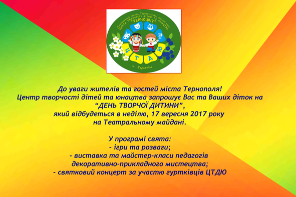 Центр творчості дітей та юнацтва запрошує Вас та Ваших діток на “ДЕНЬ ТВОРЧОЇ ДИТИНИ”, який відбудеться в неділю, 17 вересня 2017 року на Театральному майдані.