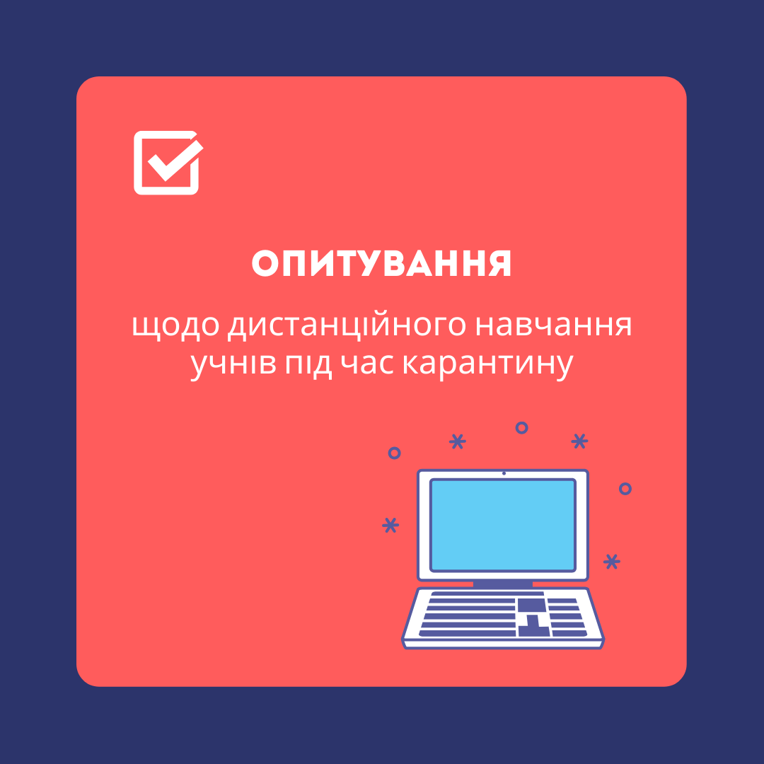 Державна служба якості освіти України (http://www.sqe.gov.ua/index.php/uk-ua/ ) проводить онлайн-опитування з питань організації дистанційного навчання учнів загальноосвітніх шкіл під час карантину. Опитування проводиться анонімно, вивчається думка усіх учасників освітнього процесу: учнів і вчителів, директорів шкіл і батьків, а його результати будуть використані для вдосконалення організації дистанційного навчання школярів.