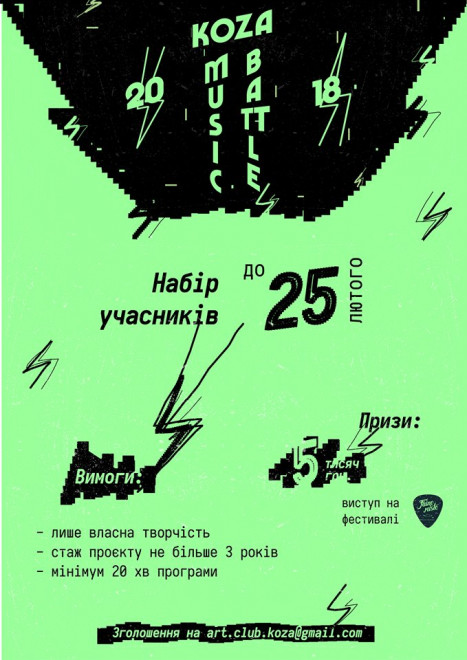 Щоб стати учасником Koza Music Battle 2018 потрібно надіслати зголошення на art.club.koza@gmail.com