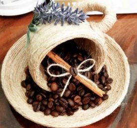 У будинку умілиці забагато кави не буває, адже жінка знає, як із користю для себе та інтер’єру використати кавові зерна. Відтак, досить узяти декілька жменьок кави, чашку, тарілку та підручні матеріали – і ексклюзивний сувенір готовий.