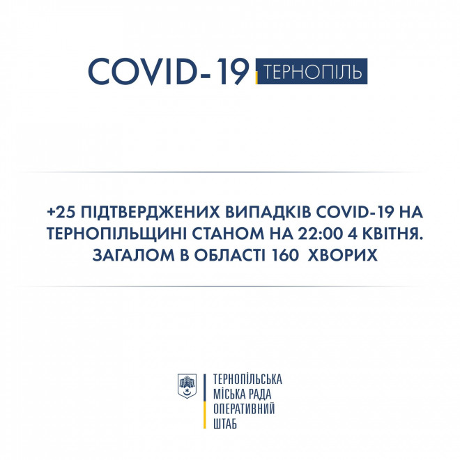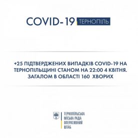 Згідно з даними обласного лабораторного центру станом на 22:00 4 квітня на Тернопільщині 160 випадків COVID-19, 2 – летальних.