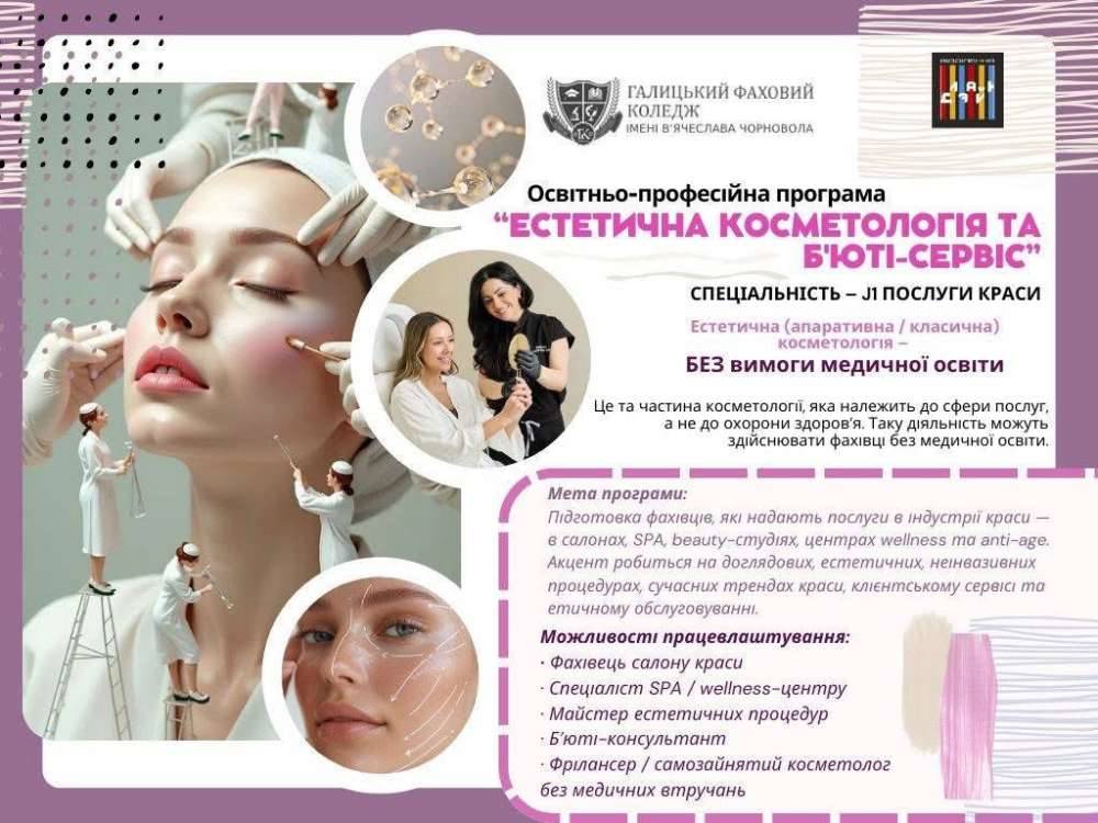 Студенти опановуватимуть б’юті-індустрію. Стань майстром естетичної косметології та б’юті-сервісу завдяки новій освітньо-професійній програмі в Галицькому коледжі імені В. Чорновола у Тернополі.