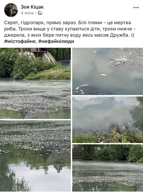 Тернополянка Зоя Кіцак у соціальній мережі розповіла про мертву рибу, яку виявили в Сереті на масиві “Дружба”.