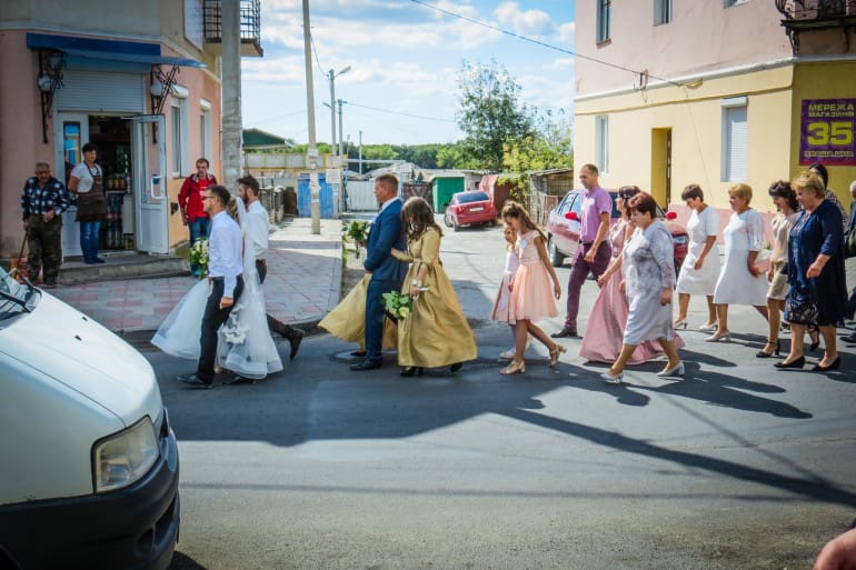 Шлюб Марія Хлян уклала у Скалаті. На фото – попереду молода, а опріч неї дружки у золотистих сукнях, а також родичі.