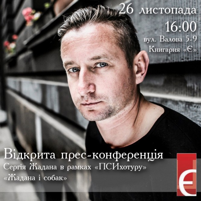 Книгарня “Є” запрошує на відкриту прес-конференцію Сергія Жадана в рамках «ПСИхотуру» «Жадана і собак». Захід відбудеться 26 листопада. Початок – о 16.00. Модератор Юрій Матевощук