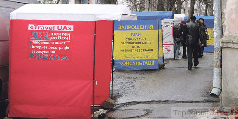 Польський візовий центр у Тернополі став хлібним місцем для «візової мафії». Нині на вулиці Танцорова, 14, де розташований візовий центр, а також довкола нього надають різні недешеві «послуги», на які є постійний попит серед тернополян. З’ясувалося, що ділки самі створюють перед заробітчанами штучні перепони, які потім «допомагають» долати за гроші. Це стосується і довжелезних черг біля «ІдеяБанку» та «КредоБанку», де оплачують консульський збір за візу. Ми спробували дізнатися, хто і скільки заробляє на прагненні тих, хто від безгрошів’я масово пакує валізи на Захід.