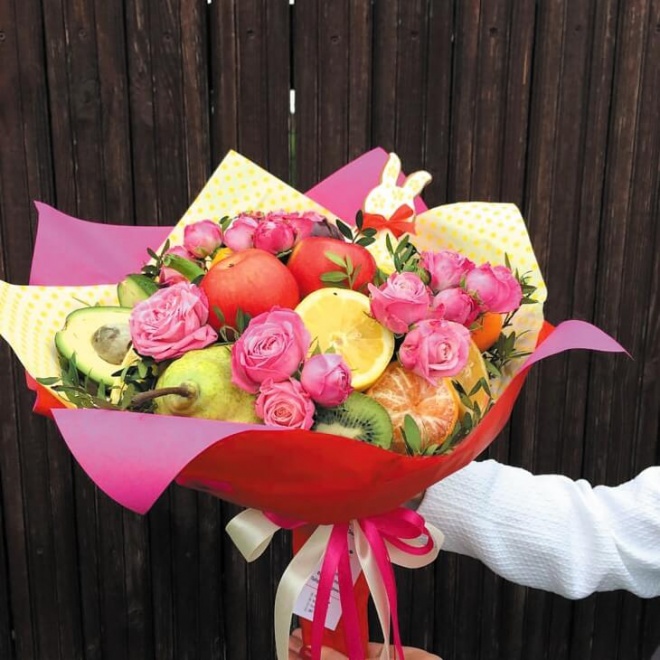 — Повністю купую все сама через те, що я дивлюся на фрукти по-іншому, — пояснює. — Мені потрібно, щоб вони були не лише смачні та свіжі, а й мали гарний вигляд, а кольори гармонійно поєднувалися. Купую і компоную букет, як кажуть, «нині на нині», за кілька годин до того, як його мають дарувати, адже фрукти, особливо порізані, при кімнатній температурі швидко псуються. Водночас такий букет ніколи не зів’яне, як квіти, на наступний день і не опиниться у смітнику, ним можна помилуватися, а потім з’їсти і ще й когось пригостити.