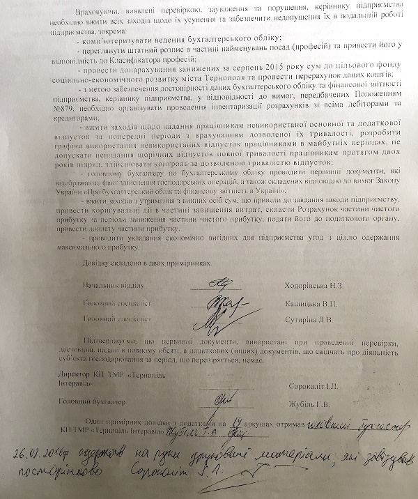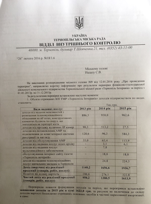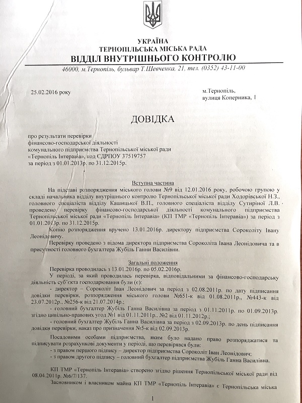 Ми вирішили проаналізувати «діяльність» депутата-директора Івана Сороколіта під час його керівництва в КП «Інтеравіа». Під час аналізу використані матеріали перевірки діяльності КП «Інтеравіа» відділом внутрішнього контролю міської ради Тернополя за період 2013-2016 роки та фінансовий звіт про діяльність КП за 2015 рік та 9 місяців 2016 року.