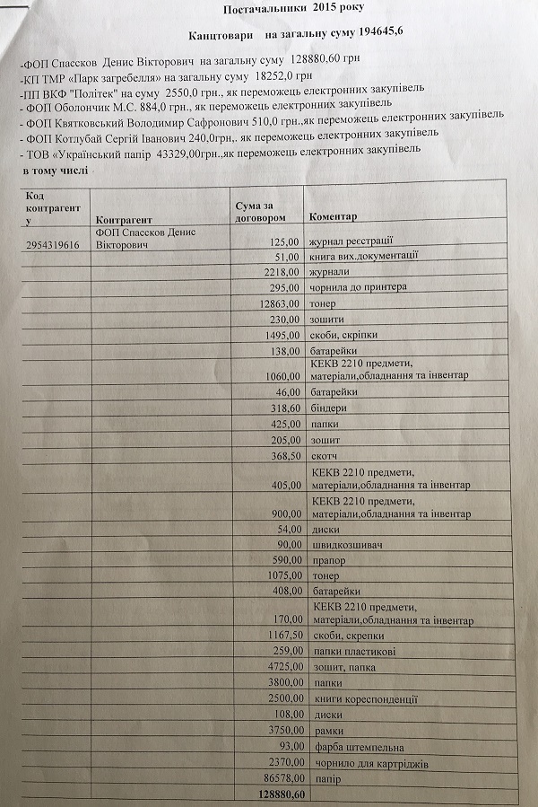 Підкреслюю – лише через офіційні документи. У міській раді ще вдалося знайти багато фінансових документів, по яким ПП Спаскову оплачувались різноманітні послуги і товари із різних управлінь міської ради на десятки тисяч гривень, зокрема лише за 2015 рік оргвідділ міської ради за можливого сприяння депутата Сороколіта замовив товарів та послуг в ПП Спассков на 128 880 грн.