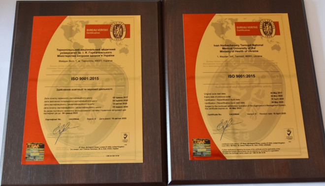 Довідково: 26 травня 2017 року Тернопільський медуніверситет за результатами сертифікаційного аудиту, проведеного зовнішніми аудиторами компанії Бюро Верітас Сертифікейшн Україна, вперше отримав сертифікат і гравертон міжнародного стандарту ISO 9001:2015 (управління якістю) за здійснення освітньої та наукової діяльності відповідно до вимог міжнародних стандартів.