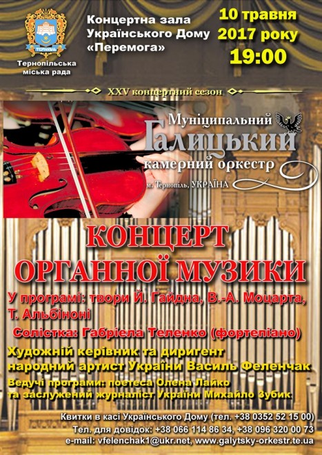 10 травня о 19 годині в Українському домі «Перемога» відбудеться концерт органної музики у виконанні Муніципального Галицького камерного оркестру під орудою народного артиста України Василя Феленчака.