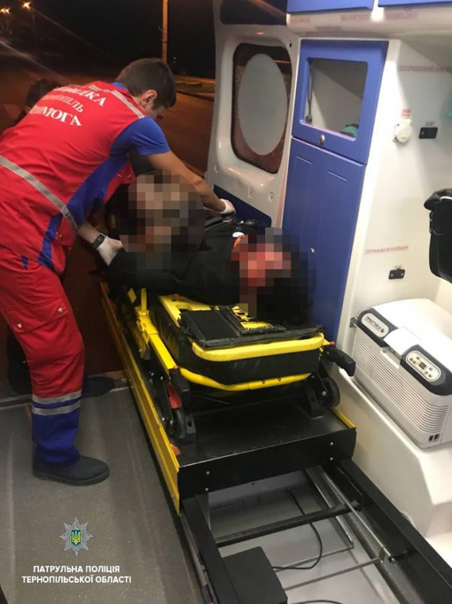 Потерпілого забрала карета швидкої медичної допомоги. За попередніми даними, у нього закрита черепно-мозкова травма, струс головного мозку, забій грудної клітки та перелом правої гомілки.