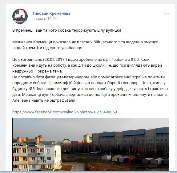 28.02.2017.відео зроблене на вул. Горбача о 8.00, коли кременчани йдуть на роботу, а їхні діти до школи. Те, що пси виглядають вкрай недружньо – окрема тема.