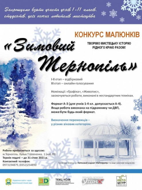 У Тернополі триває зимовий конкурс малюнків для школярів 1-11 класівДо участі у конкурсі допускаються усі учні 1-11 класів, які через полотна можуть передати красу зимового міста. Триватиме конкурс до 31 січня. Організатори заохочують учнів виконувати роботи у нестандартних техніках. Кожна конкурсна робота буде доступна до перегляду у мережі інтернет. На усіх учасників чекають приємні несподіванки – призи від співорганізаторів та спонсорів.